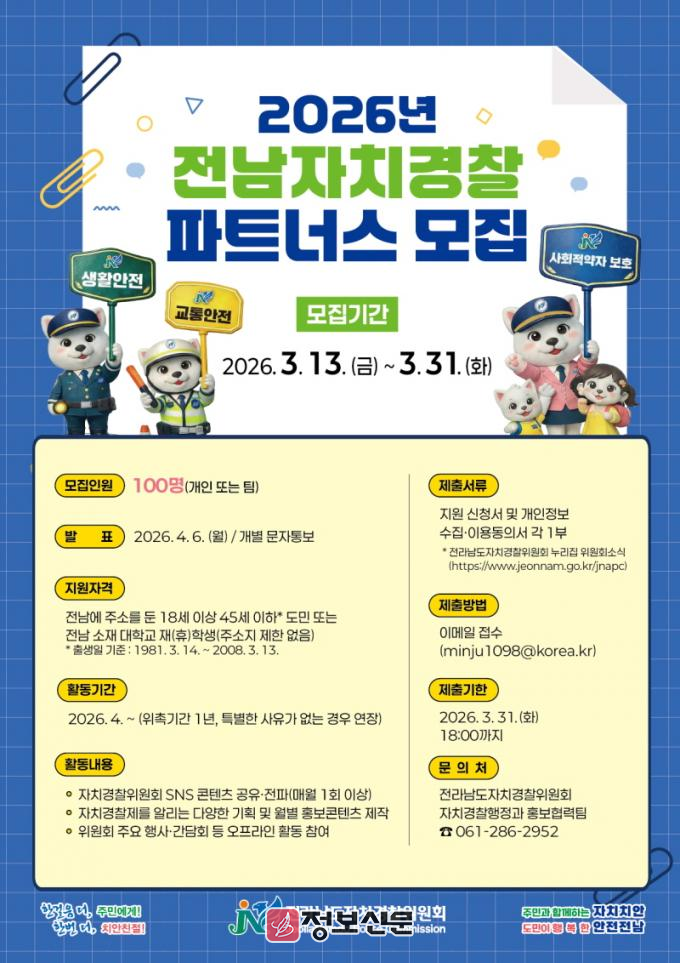 ![]() 전라남도, 2026년 전남자치경찰 파트너스 모집 |