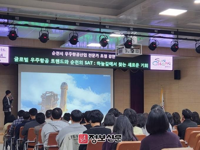 강연에서는 최근 빠르게 성장하고 있는 우주산업 시장과 위성 활용 등 최신 트렌드와 산업동향에 대한 사례 중심으로 직원들이 쉽게 이해할 수 있도록 진행됐다. 또한 시에서 추진하고 있는 우주항공사업과 ▲순천 SAT 개발 및 실증 ▲방산 클러스터 구축 ▲우주항공산업진흥원 유치 등 다양한 정책들을 공유했다.