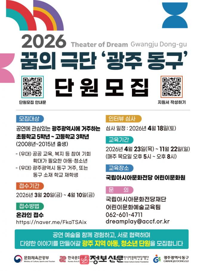 ![]() 국립아시아문화전당재단, ‘꿈의 극단 광주 동구’아동·청소년 단원 모집 |