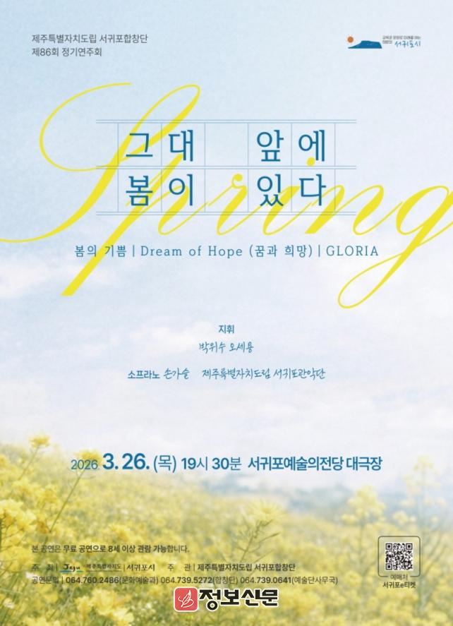‘그대 앞에 봄이 있다’라는 부제로 열리는 이번 정기연주회는 도립서귀포합창단의 2026년도 첫 정기연주회로, ‘봄의 기쁨’, ‘꿈과 희망’, ‘글로리아’ 세 개의 주제로 구성되어 봄의 아름다움을 풍성한 합창으로 그려낸다.