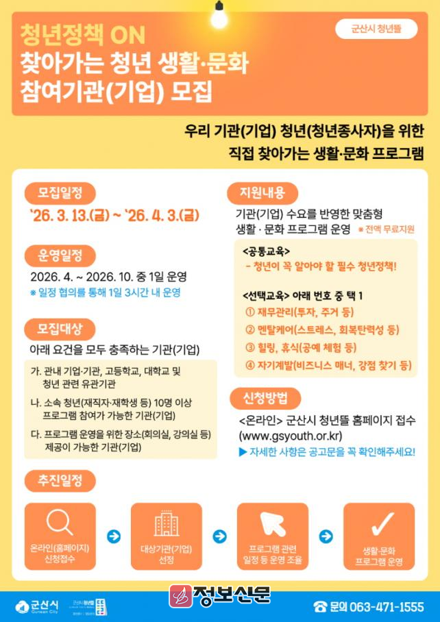 현재 모집은 4월 3일까지 진행되며, 참여를 희망하는 기관(기업)은 군산시 청년뜰 누리집을 통해 온라인으로 신청할 수 있다. 자세한 사항은 누리집 공고문을 참고하거나 청년지원팀(☎ 063-471-1555)으로 문의하면 된다.
