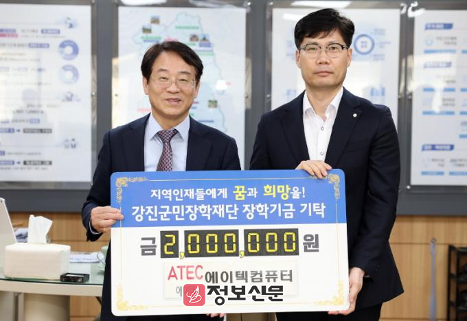 이와 함께 김형수 에이텍컴퓨터 남부사업부장은 재능과 소질이 있는 인재들의 학업을 장려하고 지원하기 위하여 2백만 원의 장학금을 첫 기탁했다. 에이텍컴퓨터 남부사업부는 광주 광산구에 소재한 컴퓨터 및 IT 장비 제조·공급 업체로 최근 5년간 강진군에 581대 규모의 PC를 공급한 바 있다. 이번 기탁은 강진 교육 발전과 지역사회 상생에 대한 관심을 실천으로 보여줬으며 첫 기탁이지만 지역 학생들을 응원하는 마음을 담아 장학사업에 힘을 보탰다는 점에서 의미가 크다.