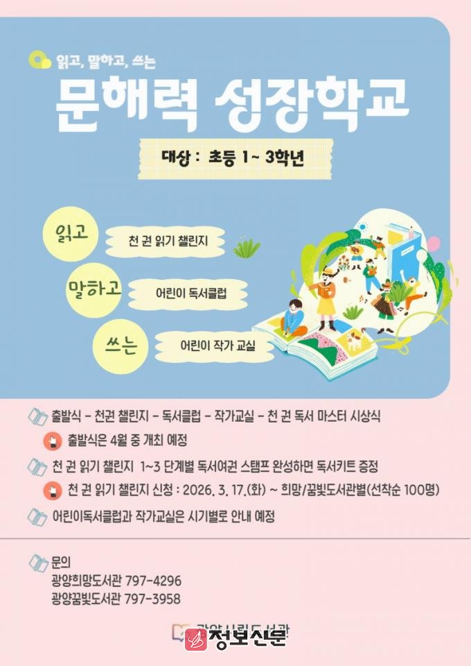 한편, 문해력 성장학교 「천 권 읽기 챌린지」는 3월 17일부터 광양시립도서관 누리집에서 광양희망도서관과 광양꿈빛도서관 각각 선착순 100명을 모집한다. 자세한 사항은 광양희망도서관(☎061-797-4296), 광양꿈빛도서관(☎061-797-3958)으로 문의하면 된다.