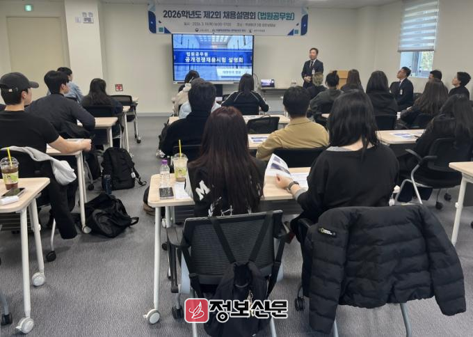 주요 프로그램은 △대한민국 사법부 및 법원공무원 제도 소개 △2026년 법원 및 등기사무직 채용 절차 △입사지원서 작성 전략 안내 △근무 환경 및 복지 혜택 △현직 선배와의 대화 순으로 진행됐다.
