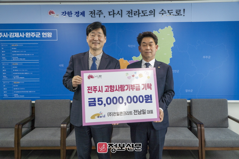 전남일 ㈜전일콘크리트 대표는 20일 전주 부시장실을 방문해 마음의 고향인 전주를 응원하는 마음을 담은 고향사랑기부금 500만 원을 기부했다.