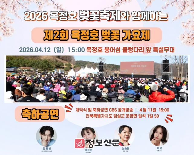 축제 첫날인 4월 11일 오후3시 개막식에는 웅장한 브라스밴드 공연과 CBS 주최 축하 공개방송이 열리며, ‘미스터트롯 3’ 최종 우승자 김용빈을 비롯해 TOP6 출신 남승민, ‘미스트롯 4’ 3위 홍성윤, 채윤 등 초호화 스타들이 출연해 옥정호의 봄을 화려하게 수놓는다.