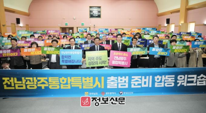 전남도와 광주시, 행안부는 25일 광주일가정양립지원본부에서 윤호중 행정안전부 장관, 황기연 전남도지사 권한대행, 고광완 광주시장 권한대행 등이 참석한 가운데 ‘전남광주통합특별시 출범 준비 합동 워크숍’을 개최했다.