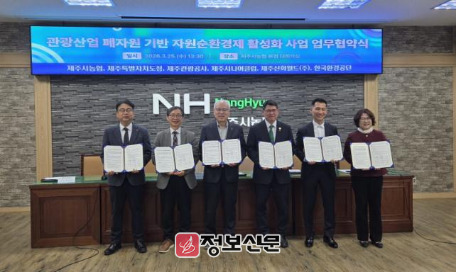 제주도는 25일 제주시 농협에서 한국환경공단, 제주관광공사, 제주시농협, 제주 시니어클럽, 제주신화월드와‘관광산업 폐자원 기반 자원순환경제 활성화’를 위한 업무협약을 체결했다.