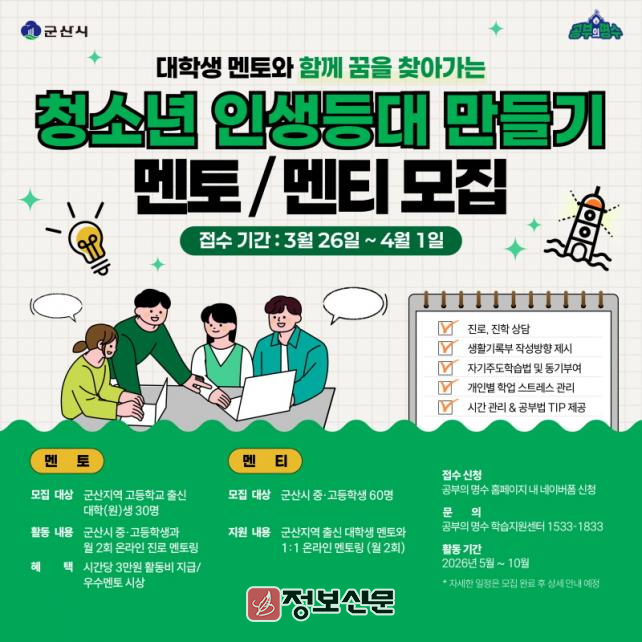 ![]() 군산시, ‘청소년 인생등대 만들기 사업 ’멘토·멘티 모집 |
