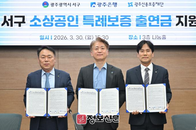 서구는 30일 김이강 서구청장을 비롯해 강지훈 광주은행 부행장, 염규송 광주신용보증재단 이사장이 참석한 가운데 ‘2026년 서구 소상공인 특례보증 지원 협약식’을 개최했다.