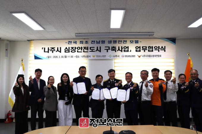나주소방서는 금일 오전 11시 전남소방본부, 나주시, 대한심폐소생협회, 나주시의용소방대연합회와 함께 ‘나주시 심장안전도시 구축을 위한 업무협약(MOU)’을 체결했다고 밝혔다.