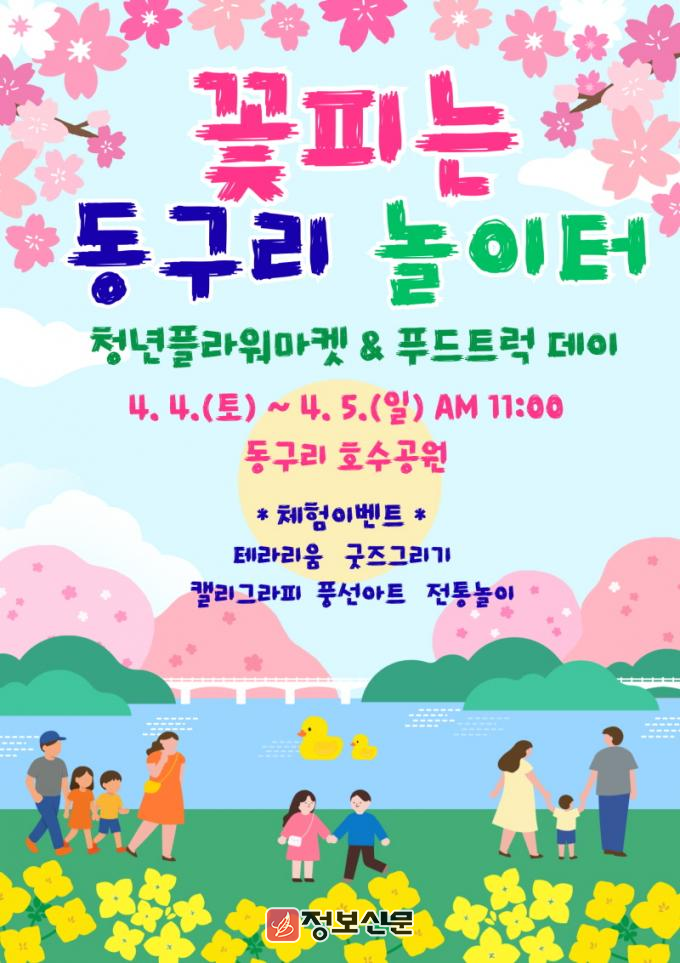 조미화 인구청년정책과장은 “벚꽃이 만개한 동구리 호수공원에서 다양한 먹거리와 체험 프로그램을 즐기며 따뜻한 봄의 정취를 만끽하시길 바란다”라고 말했다.