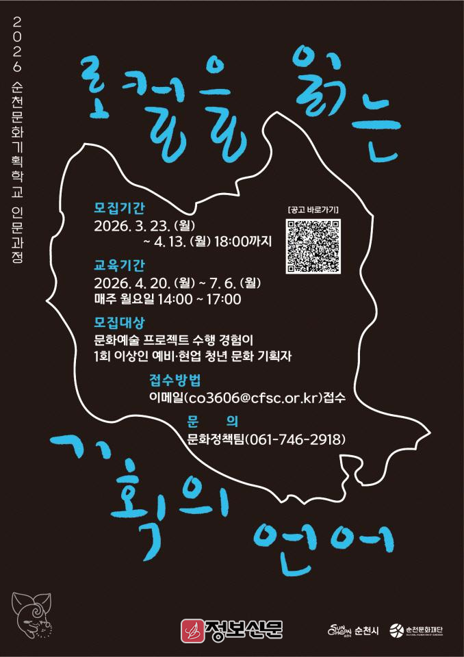 ![]() (재)순천문화재단, ‘순천문화기획학교 인문과정’ 수강생 모집 |