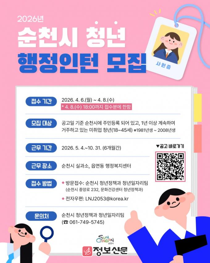 ![]() 2026년 순천시 청년 행정인턴 모집 |