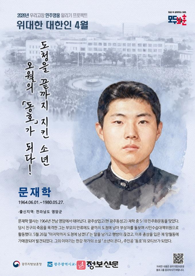 ![]() 광주보훈청, 4월 『우리고장 위대한 대한인』 문재학 열사 선정 |
