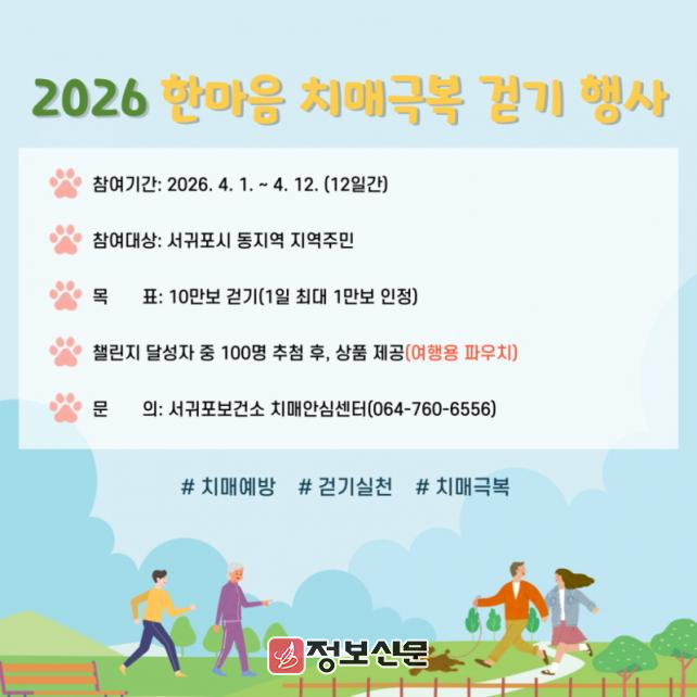 ![]() 서귀포보건소 치매안심센터, 2026년 한마음 치매극복 걷기 챌린지 운영 |
