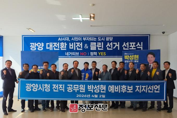 이어 “박성현 후보는 이러한 시대적 요구에 부합하는 인물로, 광양의 산업·물류·항만 등 강점을 극대화해 호남 제일의 부자 경제도시로 도약시킬 충분한 역량과 비전을 갖추고 있다”고 평가했다. 끝으로 “더 이상 광양의 정체와 후퇴를 방관할 수 없다”며 “공직 경험을 바탕으로 시민과 함께 변화를 만들어갈 박성현 후보를 적극 지지한다”고 선언했다.