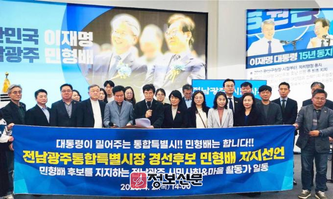 김재무 전 전라남도의회 의장과 조세철 전 광주광역시의회 부의장은 이날 공동 낭독한 선언문에서 “전남광주의 상생발전과 통합의 시대를 열어갈 적임자는 민형배 후보”라며 “지역 소멸 위기 앞에서 광주와 전남이 하나의 강력한 경제공동체로 나아가야 한다”고 밝혔다.
