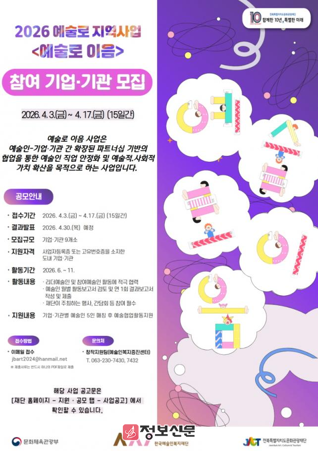![]() 전북특별자치도문화관광재단, 2026 예술로 지역사업(예술로 이음)참여기업 기관 모집 |