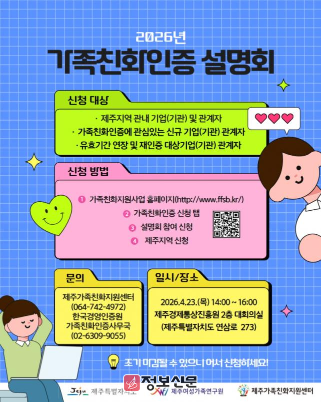 한편, 가족친화인증을 희망하는 기업(관)을 위한 설명회는 오는 4월 23일(목) 오후 2시, 제주경제통상진흥원 2층 대회의실에서 개최된다.