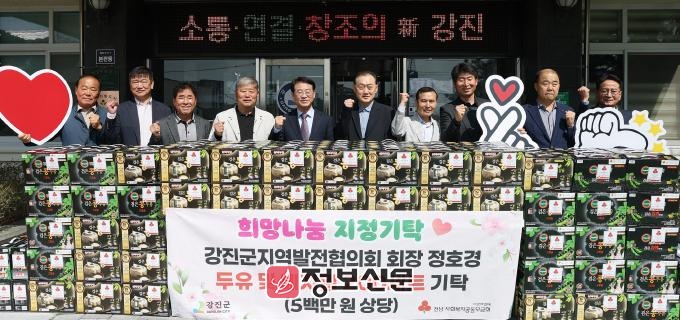 이날 기탁식은 강진군지역발전협의회 정호경 회장을 비롯해 김재평·노치경·노상남·김창석·박종제 부회장, 김광현 사무국장, 윤성일 총무 등 임원진 8명이 참석한 가운데 이뤄졌다.