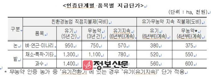 친환경직불제를 5년(5회)을 받은 농가들은 도비 사업인 유기·무농약지속직불제로 친환경농업직불제 단가의 40~50%가 지원된다. 친환경농업직불제는 올해 10월까지 친환경농산물 인증기관의 이행점검을 거쳐 인증이 유효한 것으로 통보받은 농지를 대상으로 12월에 지급할 예정이다.