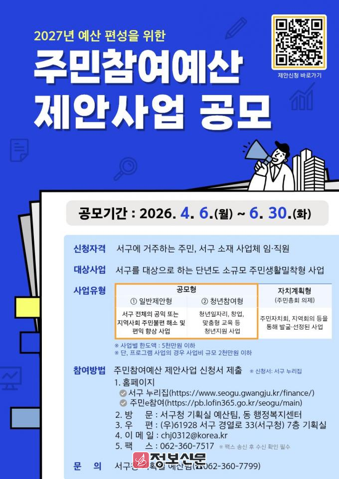 공모는 서구 주민과 서구 소재 사업체 임직원이 참여할 수 있다. 제안은 서구 누리집(구정살림-주민참여예산제-제안사업신청)을 통한 온라인 신청과 우편·전자우편·팩스·방문 접수 등으로 가능하다. 자세한 사항은 서구청 기획실 예산팀(062-360-7799)으로 문의하면 된다.