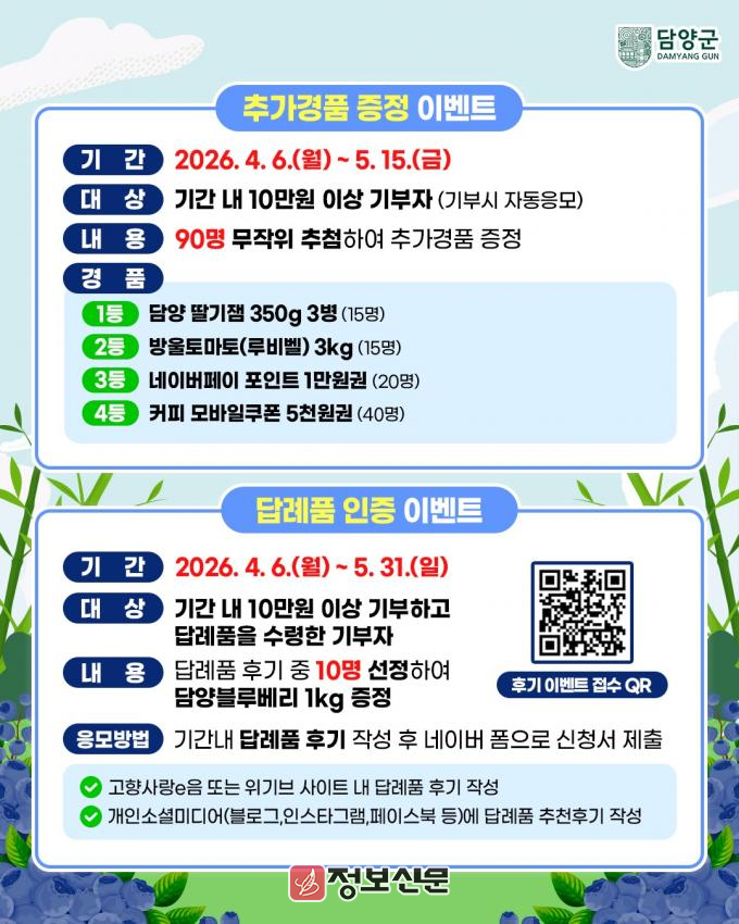인증 이벤트는 4월 6일부터 5월 31일까지 담양군에 10만 원 이상 기부하고 답례품을 받은 기부자를 대상으로 하며, 정성스러운 후기를 작성한 기부자 중 10명을 선정하여 담양 블루베리 1kg을 증정한다.