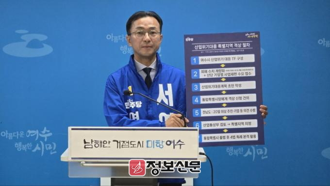 한편, 서 예비후보는 "산업위기대응특별지역으로 격상되면 KTX 고속화·공항·전력·폐수처리시설 등 기반시설 국비 우선 지원과 통합특별법 제226조 보조금·재정투융자 우대 지원이 실질적으로 작동한다"고 설명하면서, “여수시는 전문가로 구성된 회의체를 구성하여 잘 준비해야 하며, 당장 산업위기대응특별지역 신청에 나서야 한다”고 주장했다.