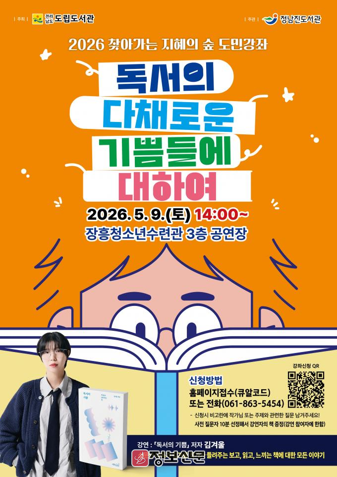 장흥군 정남진도서관은 오는 5월 9일 오후 2시 장흥청소년수련관 공연장에서 북튜버이자 작가인 김겨울을 초청해 ‘2026년 찾아가는 지혜의 숲 도민강좌’를 개최한다고 밝혔다.