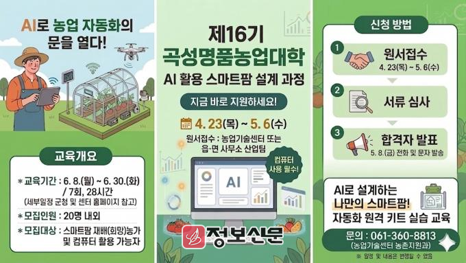 ![]() 곡성명품농업대학 ‘AI 활용 스마트팜 설계 과정’ 신입생 모집 |