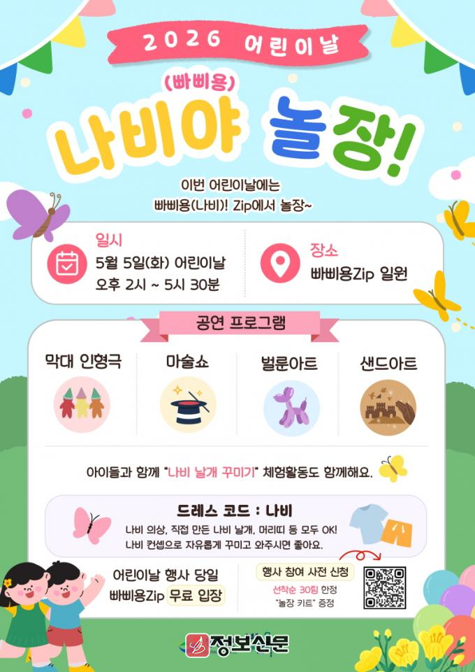 이번 축제의 핵심은 방문객이 직접 주인공이 되는 ‘참여형 프로그램’이다. 행사장에는 ‘나비 로드’가 조성되며, 드레스코드는 ‘나비’로 설정돼 나비 날개, 머리띠 등 다양한 소품과 의상을 활용해 아이들이 축제의 한 장면을 직접 완성하게 된다.