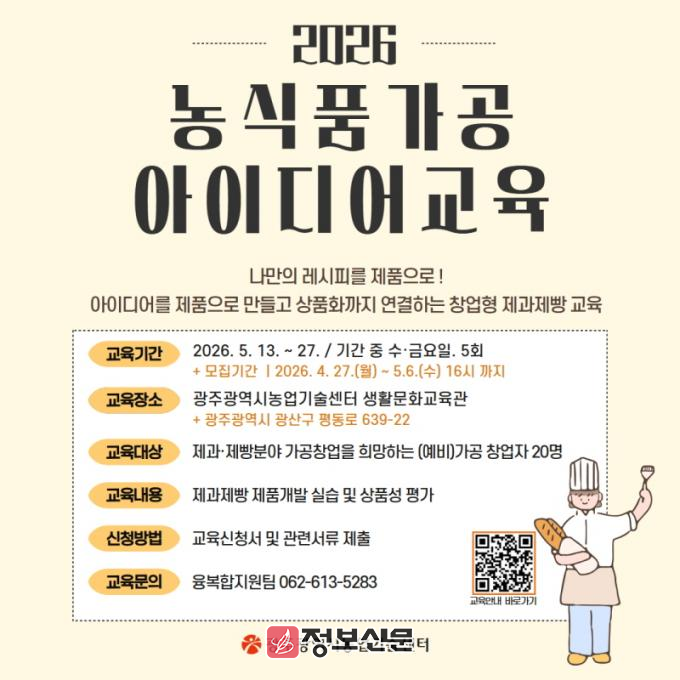 ![]() 광주광역시, 제과제빵 농식품가공 창업교육 운영 |