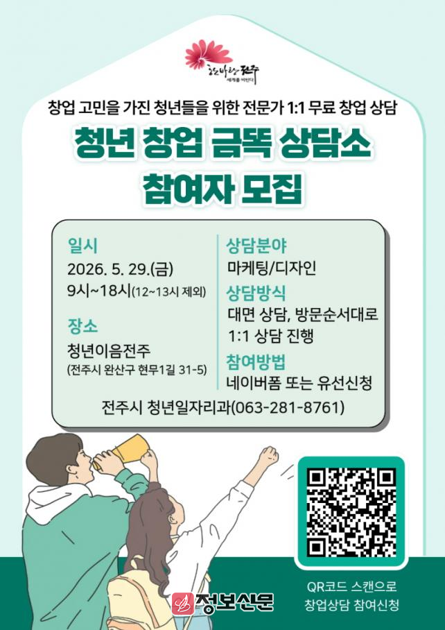 시는 오는 5월 29일 청년이음전주에서 전북지방중소벤처기업청과 공동으로 비즈니스지원단 전문 상담을 제공하는 ‘청년 창업 금똑 상담소’를 운영한다.
