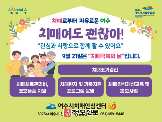 ![]() 여수시(시장 정기명)는 제17회 치매극복의 날을 맞아 오는 23일부터 27일까지 치매극복 주간 행사를 운영한다. |