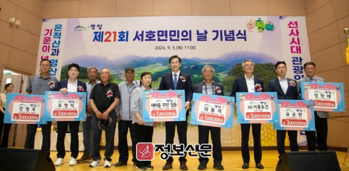 5일 서호면민의 날 행사에서 거룡토건 직원 일동이 500만원을, 유승완 남경건설 소장과 강병욱 명신건업 대표가 각각 300만원을, 유맹덕 재경서호면향우회장과 이동석 전 재경서호면향우회장, 장복주 광양시 이장단장, 정항채 강진군 이장단장이 각각 100만원을, 새마을 주민 일동이 120만원을 기탁했다.