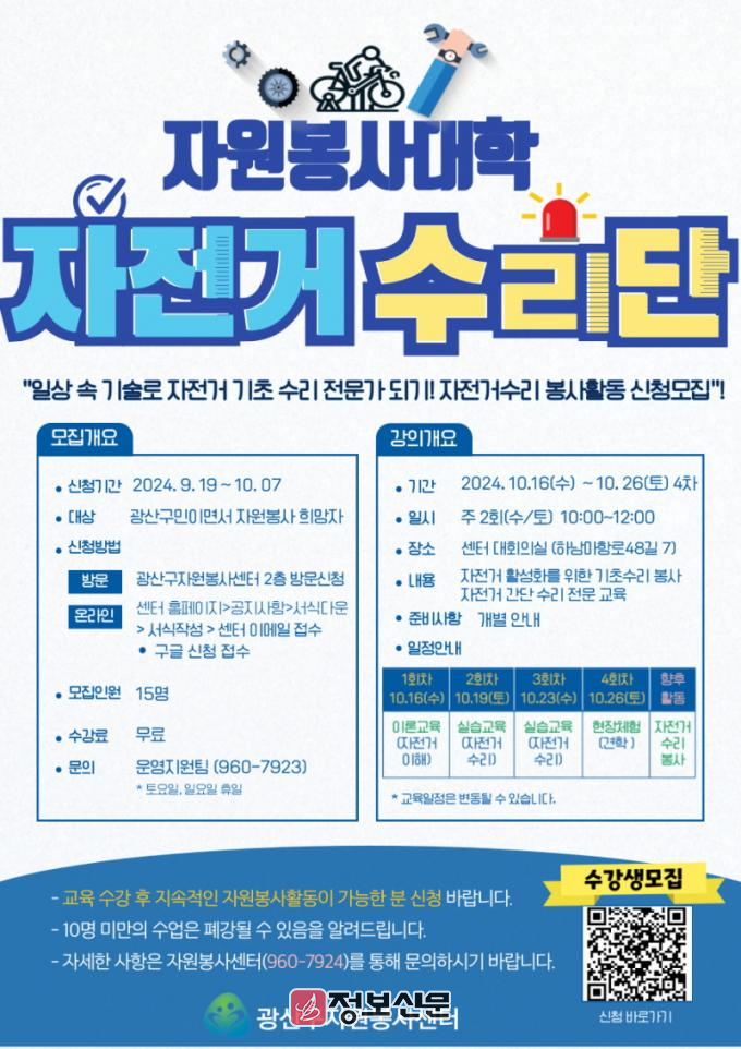 이번 프로그램은 자원봉사자의 역량을 강화하고, 자전거 수리 기술을 통해 지역사회에 실질적인 도움을 주기 위해 마련되었다. 모집 기간은 9월 19일부터 10월 7일까지이며, 광산구민 15명을 선발한다.
