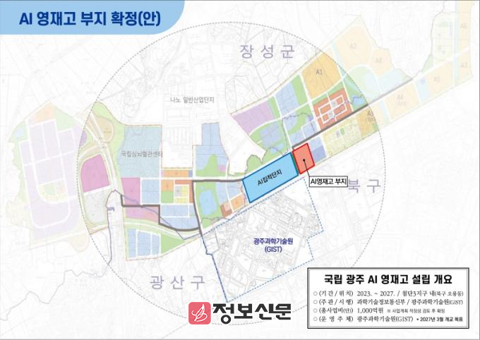 광주광역시(시장 강기정)는 광주과학기술원(GIST)과 인접한 북구 첨단3지구 인공지능(AI)집적단지 바로 옆 부지(오룡동 468일원)에 건축연면적 2만40㎡, 지하 1층~지상 5층의 학습연구동과 기숙사동 2개동 규모의 광주AI영재고등학교를 건립, 2027년 개교할 계획이다.