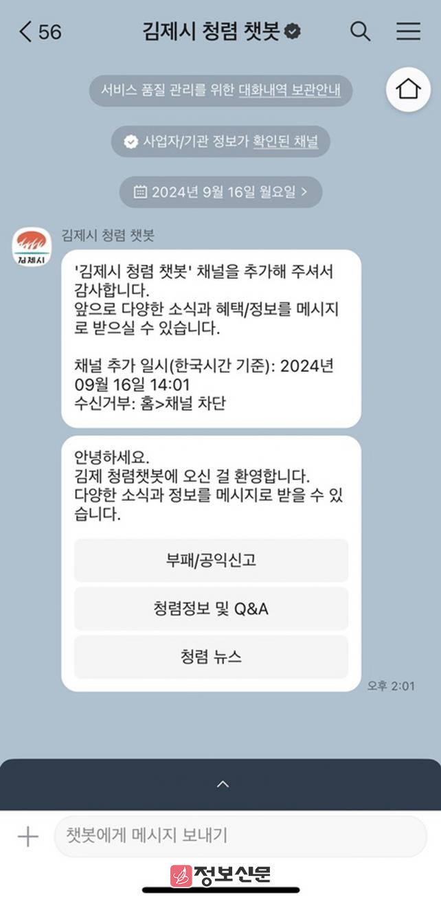 ![]() 김제시, 24시간 접속가능한 청렴챗봇 서비스 도입 |