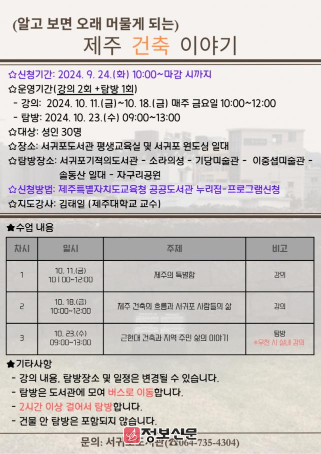 ![]() 서귀포도서관, 제주 건축물과 공간에 대한 강의와 탐방 참가자 모집 |