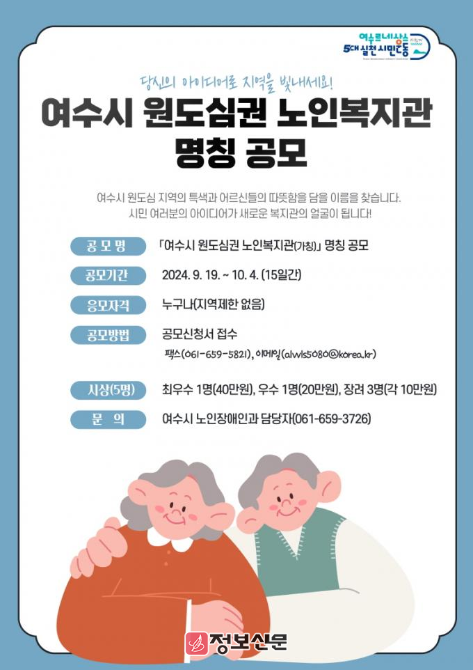 ![]() 여수시(시장 정기명)가 원도심권 노인복지관 명칭을 오는 10월 4일까지 공모한다. |