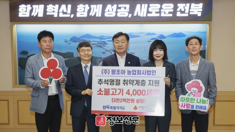 전북특별자치도에 따르면 20일 ㈜팜조아는 전북특별자치도를 방문해 3천2백만원 상당의 소불고기 세트 4,000개를 기탁하며 지역사회에 따뜻한 온정을 전했다.