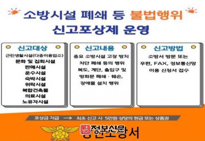 소방시설 불법행위 신고포상제는 비상구 등 소방시설에 가해지는 불법행위를 신고하는 경우 포상금을 지급하는 제도다. 소방시설에 대한 시민의 경각심 고취와 안전의식 확산을 통해 화재를 예방하고 피해를 최소화하고자 추진된 제도다.