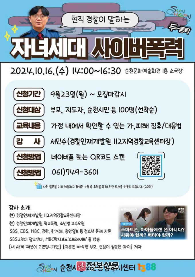 ![]() 순천시, 2024 전문가 초청 부모 토크 콘서트 「자녀세대 사이버폭력」 개최 |