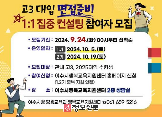 ![]() 여수시(시장 정기명)가 관내 고등학교 3학년 학생과 재수생 등 2025 대입 수험생을 대상으로 ‘대입 면접 준비 1:1 집중 상담’을 운영한다.