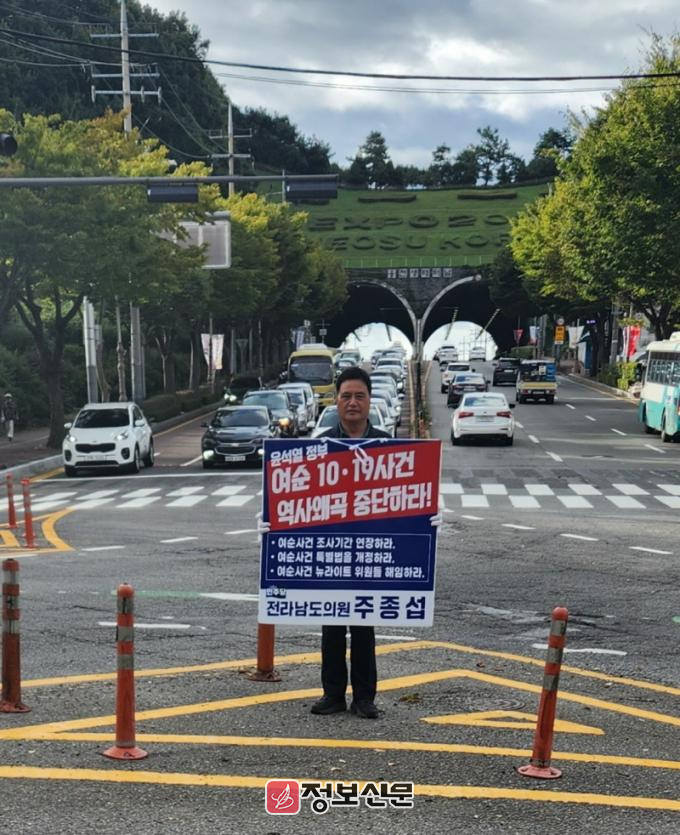 ![]() 주종섭 의원이 지난 23일 여순 10·19사건 역사왜곡 중단을 촉구하는 1인 시위를 진행하고 있다. |