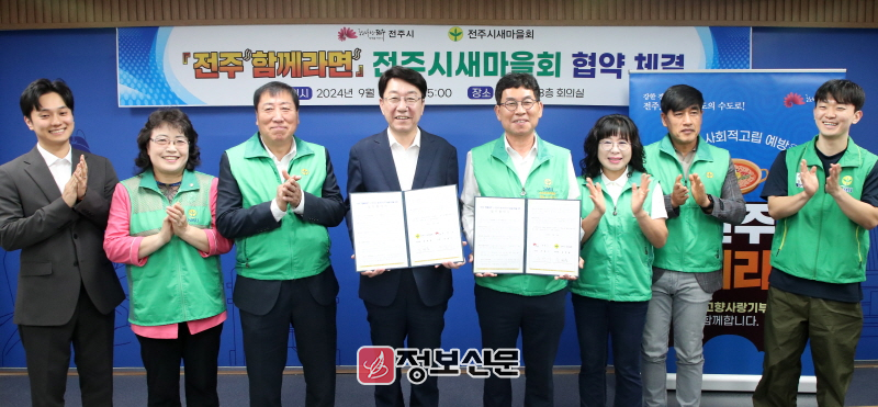 전주시와 전주시새마을회는 24일 시청 3층 회의실에서 우범기 전주시장, 송병용 전주시 새마을회 회장과 박창석 새마을지도자 전주시협의회장, 유선영 전주시새마을부녀회장, 한복순 새마을문고 전주시지부 회장 등 전주지역 새마을회 임원들이 참석한 가운데 ‘전주 함께라면 위기가구 발굴과 기부와 나눔문화 활성화를 위한 업무협약’을 체결했다.
