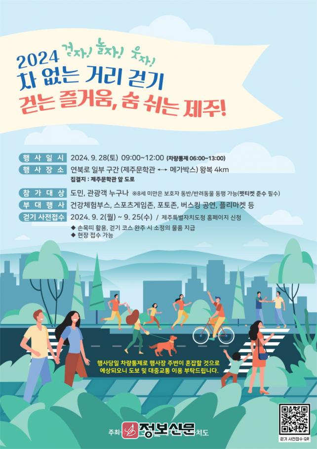 강동원 제주도 안전건강실장은 “이번 차 없는 거리 걷기 행사는 도민의 건강 증진, 환경 보호, 지역 공동체 강화 등 여러 목표를 동시에 추구한다”며 “도민 안전을 최우선으로 하면서 동시에 참가자 모두가 즐겁고 의미 있는 경험을 할 수 있도록 준비에 만전을 기하고 있다”고 말했다.