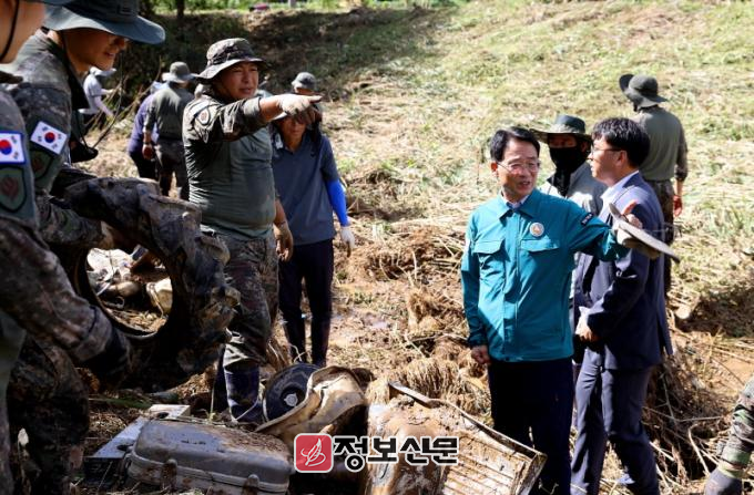 이보다 하루 앞선 23일, 군은 교통 소하천 현장에 굴삭기 2대와 덤프 2대를 현장에 투입하는 등 선투입 후정산으로 긴급하고 신속한 복구에 최선을 다하고 있다.