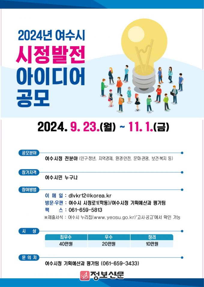 ![]() 여수시(시장 정기명)는 시민들의 창의적인 제안을 시정에 반영하고, 시정에 대한 활발한 참여를 이끌어내기 위해 ‘시정발전 아이디어’를 공모한다.